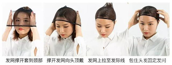 1:戴好發(fā)網(wǎng)。先將發(fā)網(wǎng)撐開(kāi)套到頸部的位置,接著用雙手撐著發(fā)網(wǎng)向頭頂方向移動(dòng),像扎頭發(fā)一樣提拉到發(fā)際線(xiàn)的位置。