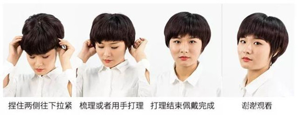 3:調(diào)整假發(fā)。假發(fā)套戴的時(shí)候要捏住兩側(cè)往下拉緊,調(diào)整到合適的高度和位置,再用梳子或者手指稍微梳理一下就大功告成了!